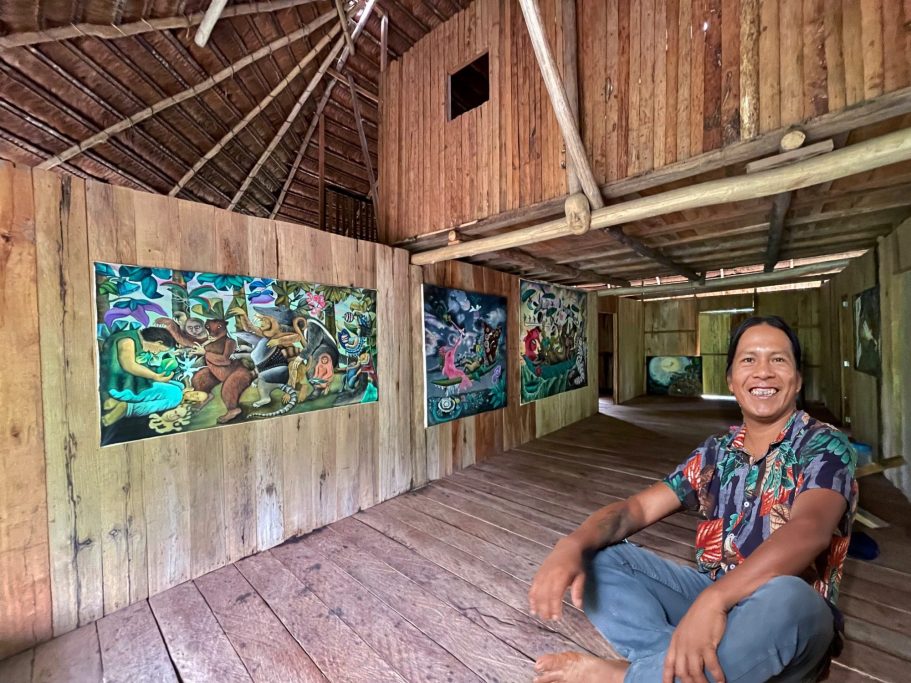 Soy pintor autodidacta perteneciente a los pueblos originarios murui y bora, de la Amazonía peruana. Vivo en Pucaurquillo, una comunidad ubicada en la cuenca del río Ampiyacu en la región Loreto. Desde muy niño, escuchaba de mis padres historias fantásticas cuando estábamos en la chacra, pescando, o conversando en casa durante las profundas noches amazónicas. Esos relatos alimentaron mi imaginación y mi sensibilidad por la naturaleza y los grandes misterios de la vida. Además me enriqueció conocer el mundo occidental, respetarlo, e interactuar. Todo esto está en mi obra.