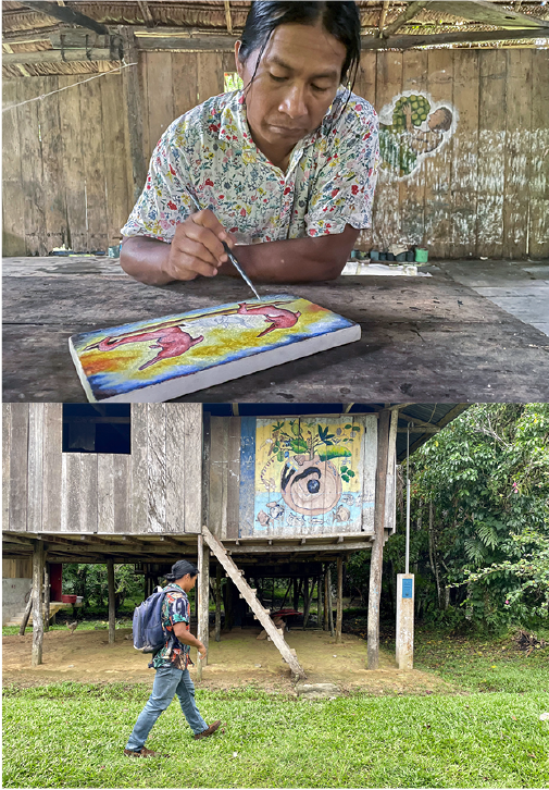 Mañana irá a su estudio, construido en la chacra familiar. Allí lo esperan sus pinceles y sus grandes lienzos de llanchama, la corteza que sirve de lienzo. Le gusta cómo huele el ojé, ese gran árbol sagrado del que se obtiene. Cada trazo, cada pincelada, recoge la memoria de su infancia. Recuerdos de su padre, Mauricio Rubio, pintando para vender su obra a los turistas que iban o venían de la frontera; y a su madre, Marlen Churay, preparando los tintes naturales para la realización de cada pintura y el kasabe para el almuerzo.