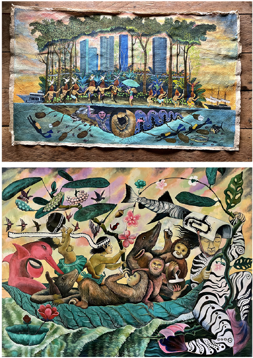 - Sí, mis pinturas también abordan temas sociales, históricos y políticos que afectan a mi pueblo y a la Amazonía en general, tales como la contaminación ambiental, los crímenes de los caucheros contra mis antepasados, la corrupción y los agentes externos que imponen programas de desarrollo sin conocer la realidad local.